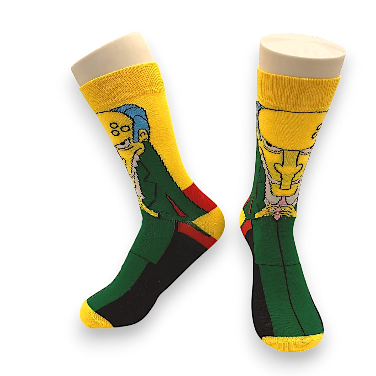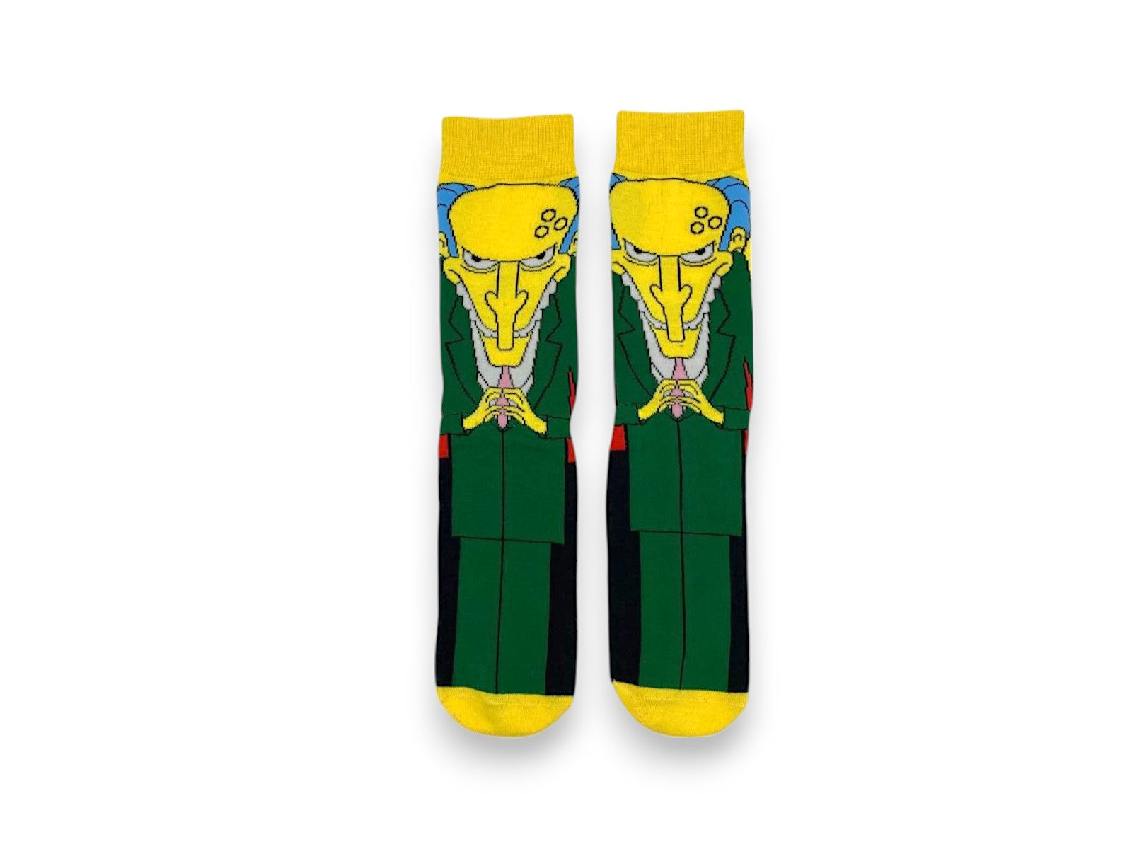 Step into the world of Springfield with these hilarious Mr. Burns socks! Featuring yellow, green, and black colors inspired by the iconic evil character, these comfy socks are perfect for Simpsons fans who want to add a touch of mischief to their outfit. Show off your love for the classic villain in style and enjoy all-day comfort with every step.